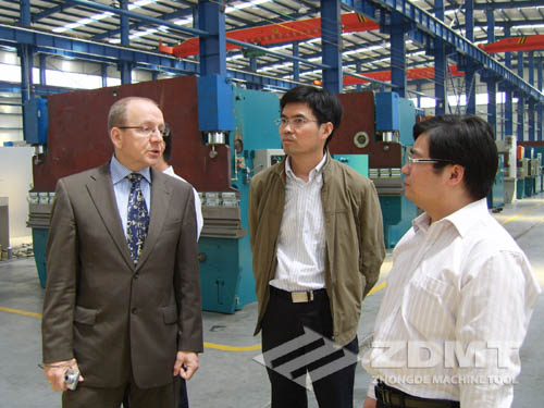 在整個(gè)的參觀過程里, EDWIN先生了解了我們先進(jìn)的工廠全程監(jiān)控系統(tǒng),寬敞明亮的工作車間以及外形簡潔優(yōu)雅的產(chǎn)品。相信在韓總流暢的英文翻譯下,EDWIN先生一行對本地區(qū)剪折行業(yè)的發(fā)展?jié)摿σ欢ㄓ辛诵碌恼J(rèn)識。同時(shí),我們很感謝韓總和EDWIN先生,他們站在一個(gè)全新的角度,對中德機(jī)床提出了建設(shè)性的建議。我們也希望中德機(jī)床精益求精,同ESTUN公司和DELEM產(chǎn)品建立更緊密的關(guān)系,將中德機(jī)床推向更廣闊的市場。