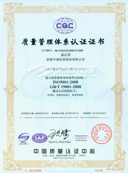 2010年4月,我公司順利通過了ISO 9001:2008版換證復(fù)審,獲得認(rèn)證證書(證書編號:00110Q23628R2S/3400)。在此次復(fù)審過程中,中國質(zhì)量認(rèn)證中心(CQC)對我公司的質(zhì)量體系運行情況進(jìn)行了全方位嚴(yán)格審核,并對中德公司質(zhì)量管理工作給予了充分的肯定。