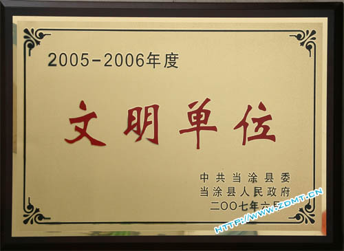 近日,我公司被中共當(dāng)涂縣委、當(dāng)涂縣人民政府聯(lián)合授予“當(dāng)涂縣2005-2006年度縣文明單位的”光榮稱號(hào),這標(biāo)志著我公司在制度化、規(guī)范化、科學(xué)化管理方面邁上了一個(gè)新的臺(tái)階。近年來,我公司穩(wěn)抓精神文明建設(shè),努力為員工、社會(huì)營(yíng)造健康、和諧的工作、生活環(huán)境,做到了物質(zhì)文明和精神文明建設(shè)雙豐收、雙促進(jìn)。